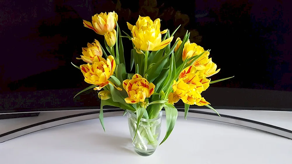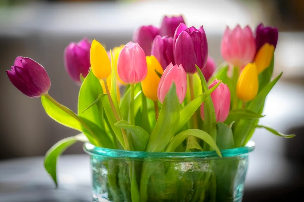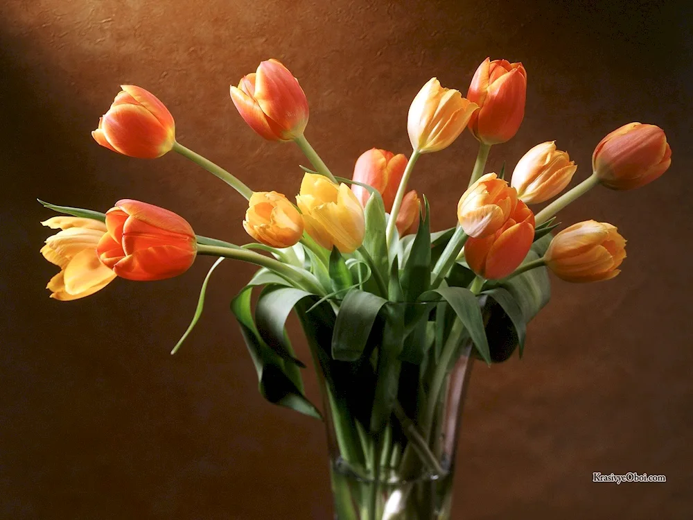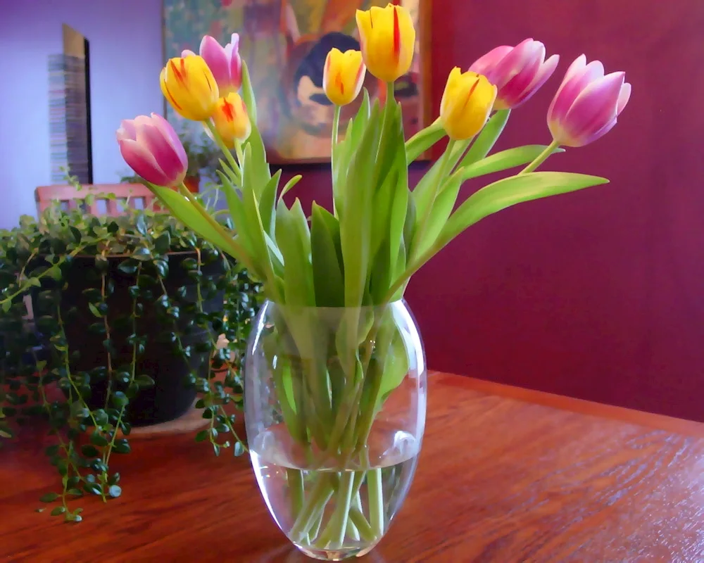 Here are some pictures of beautiful tulips in a glass vase. The vibrant colors and delicate petals will surely brighten up any room!