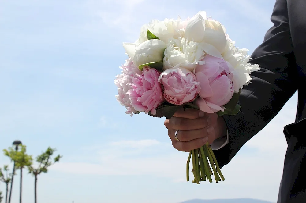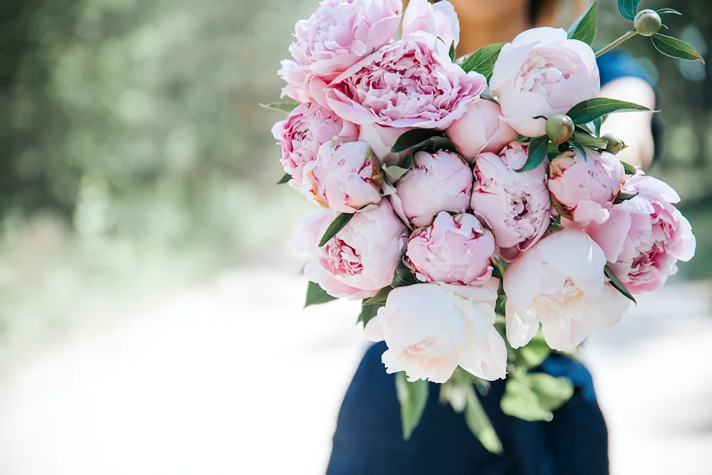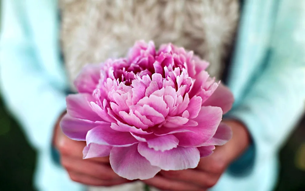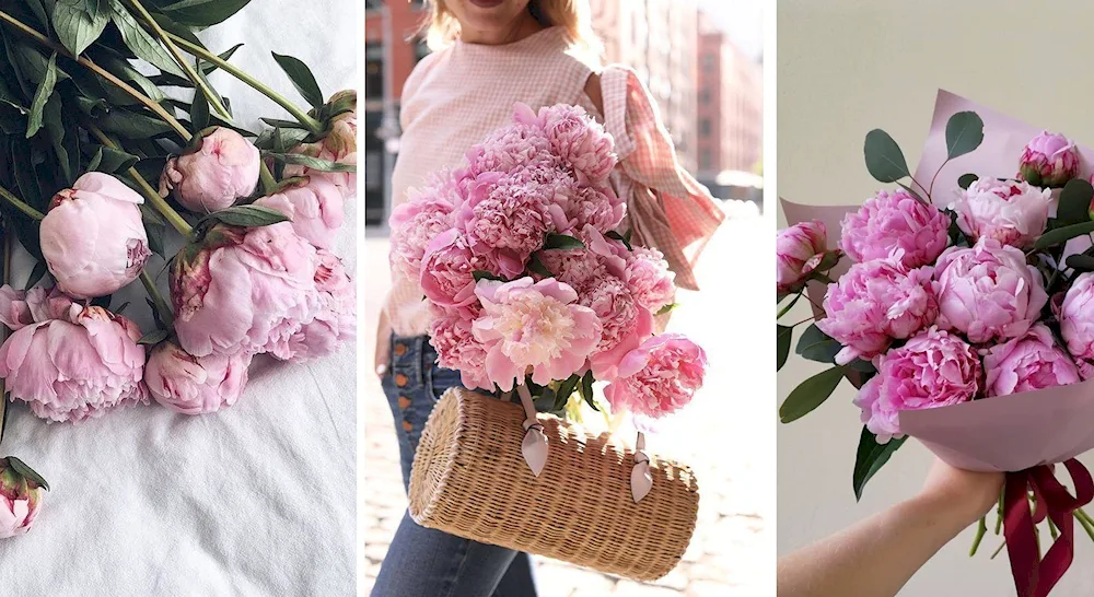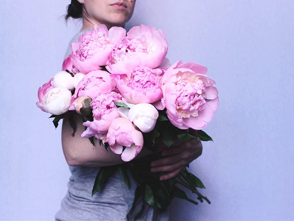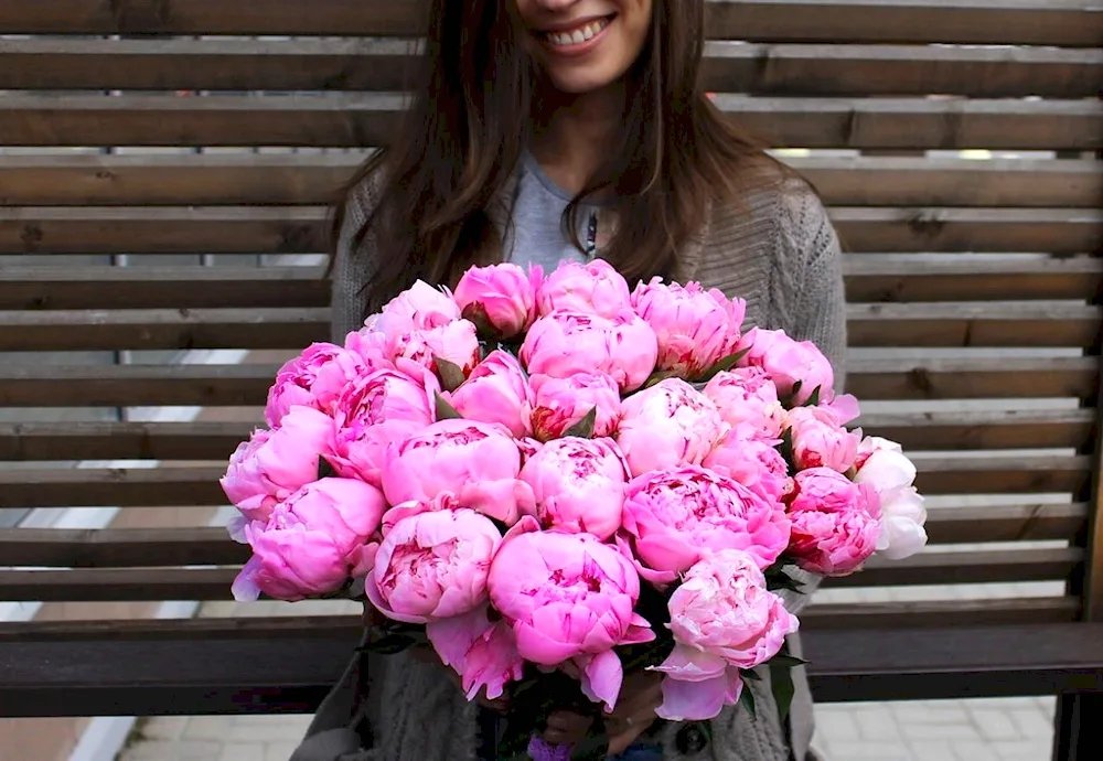 Photo with peonies in hands Here are some lovely pictures of someone holding beautiful pink peonies in their hands. The delicate flowers contrast beautifully against the person's skin, creating a stunning visual composition.