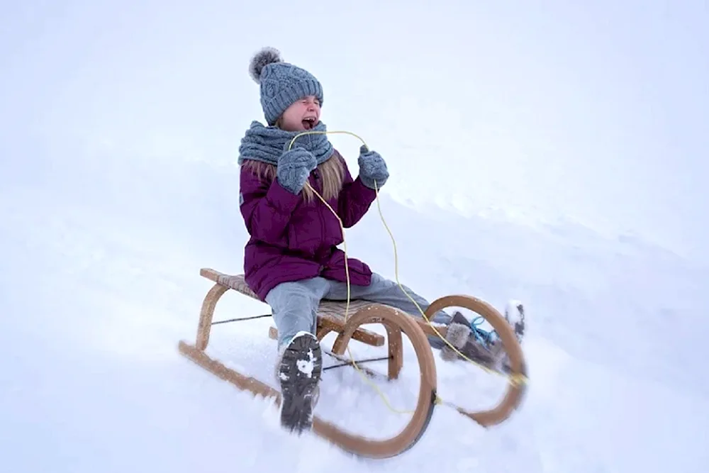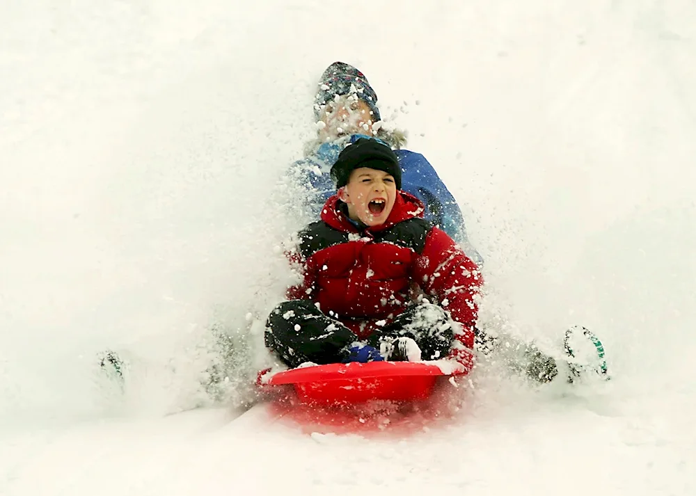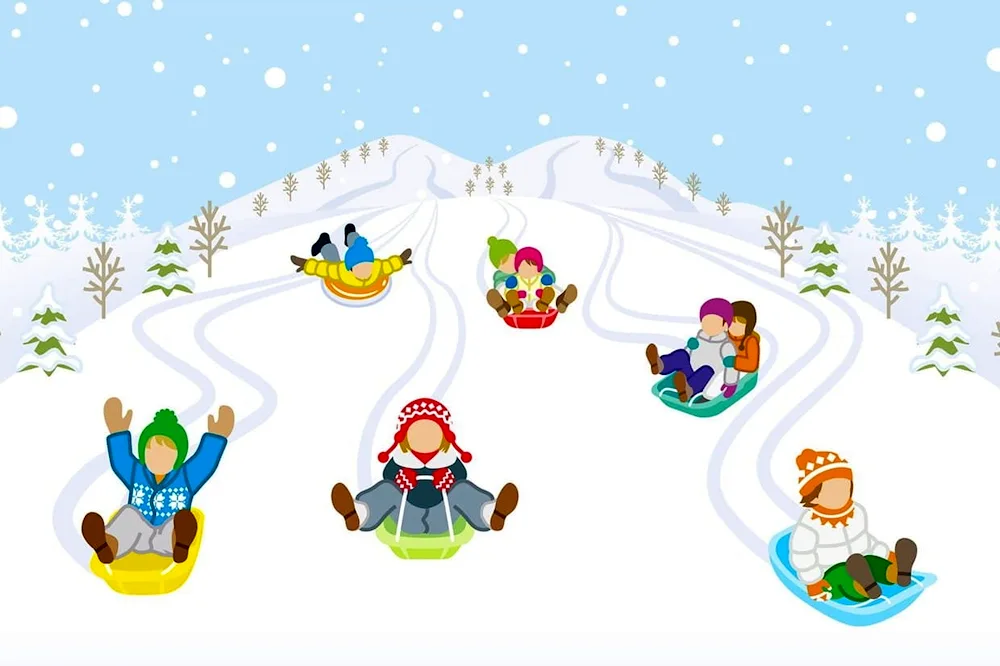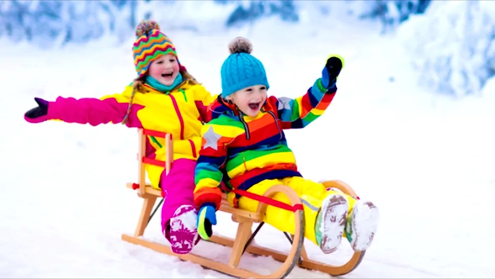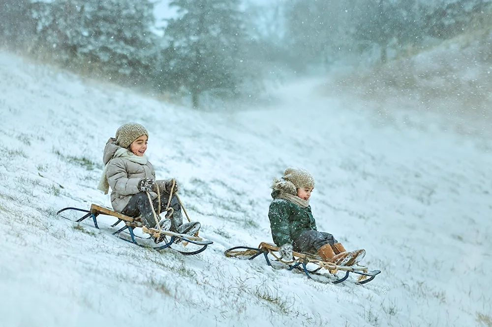Picture of children sledding in winter Photos of kids enjoying themselves while sledding down snowy hills in the wintertime. The children are bundled up in winter coats and hats, with big smiles on their faces as they glide down the slopes on their sleds.