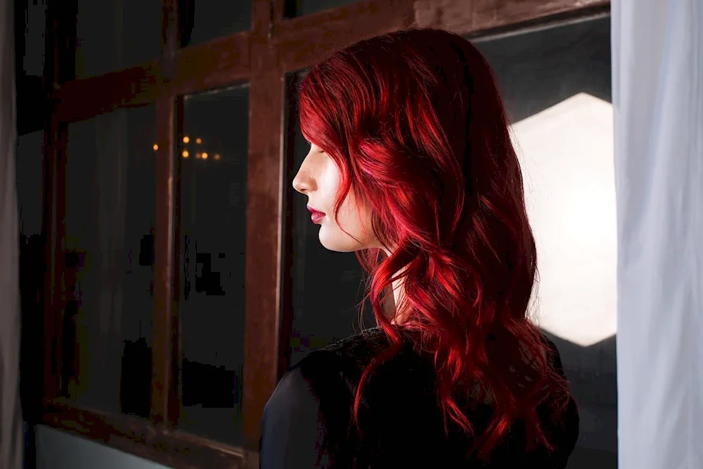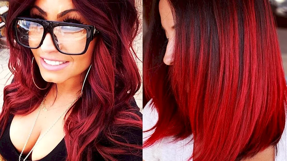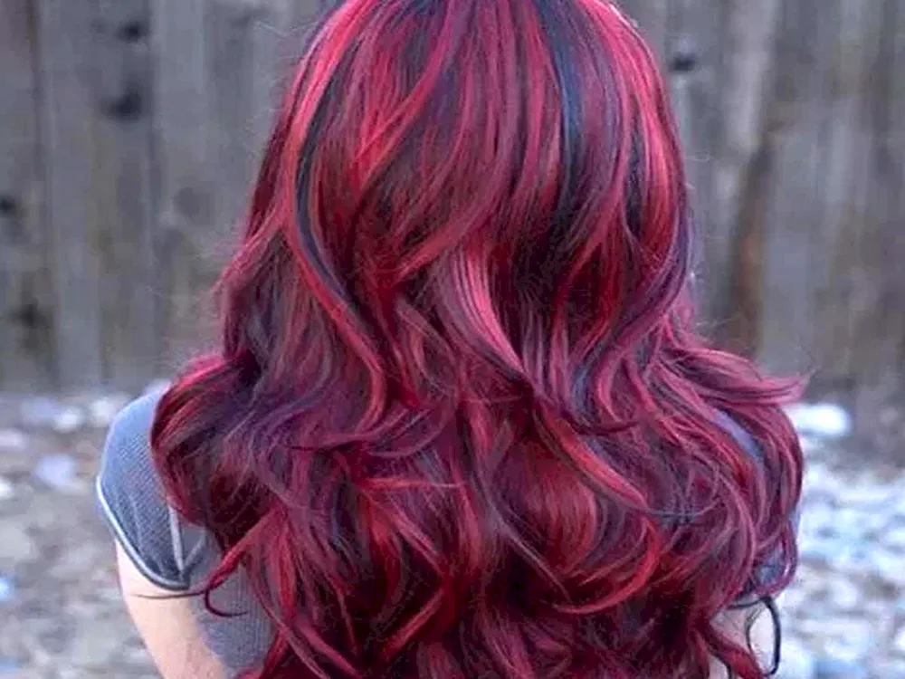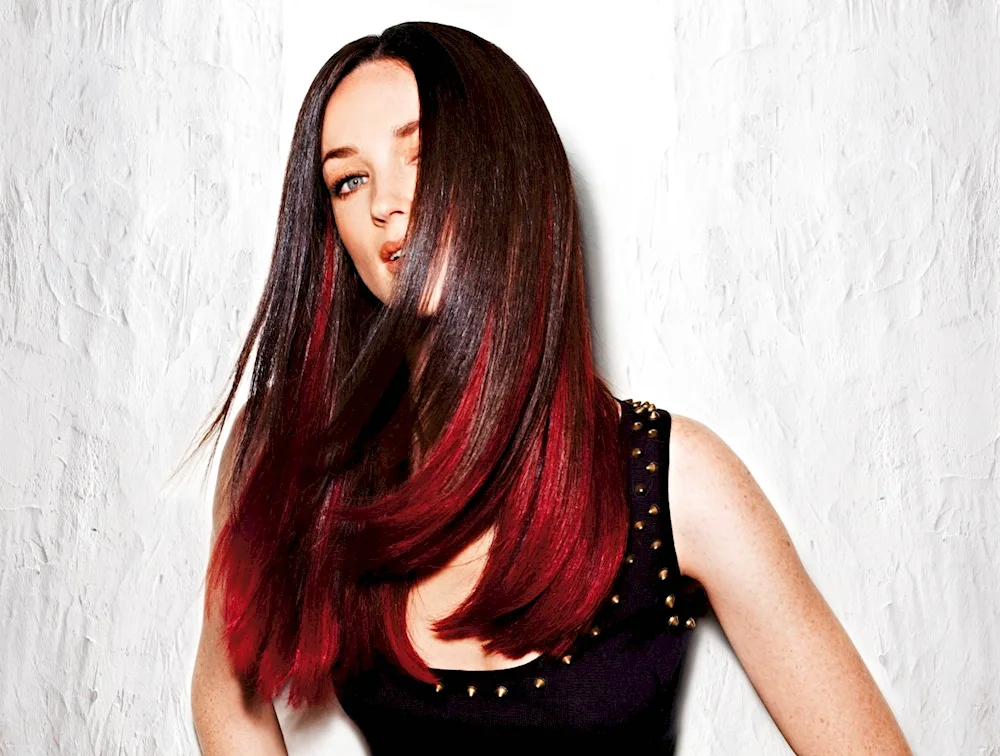 Red highlights streak across the dark hair, creating a bold and striking look that adds depth and dimension to your hairstyle. The vibrant hue contrasts beautifully against the dark base, making for a stunning and eye-catching style.