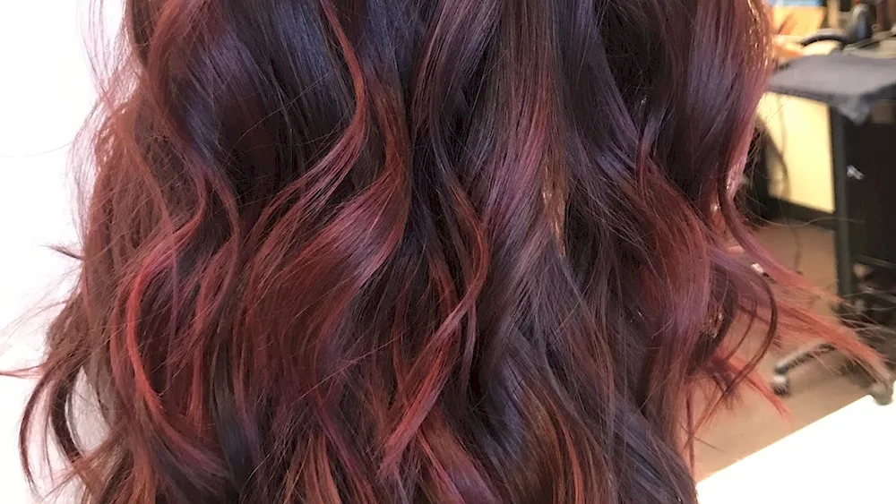 Red highlights on dark hair Images showcasing red streaks on black locks, perfect for adding a bold pop of color to your hair. Take inspiration from these stunning photos to elevate your dark hair with vibrant red highlights.