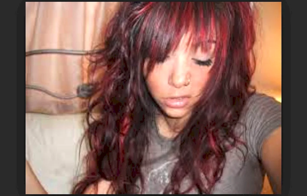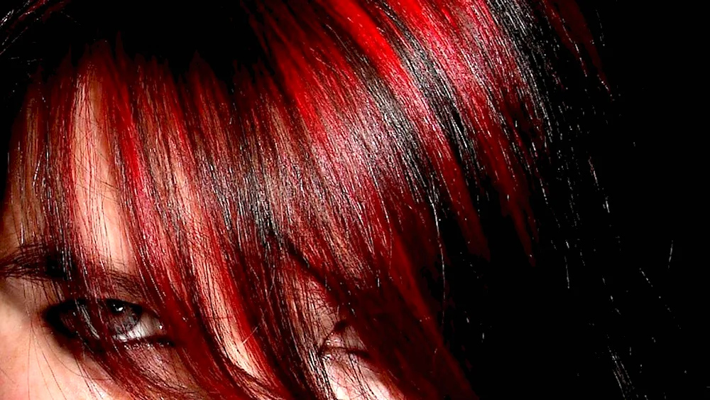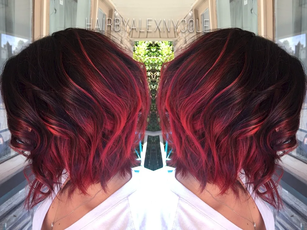 Red highlights on dark hair  Images showcasing red streaks on black locks, perfect for adding a bold pop of color to your hair. Take inspiration from these stunning photos to elevate your dark hair with vibrant red highlights.
