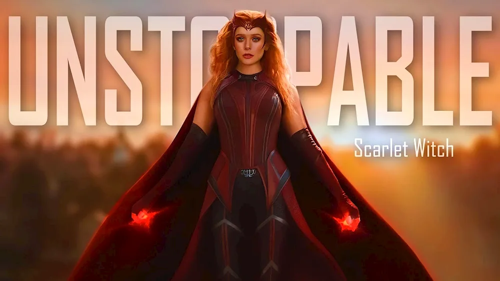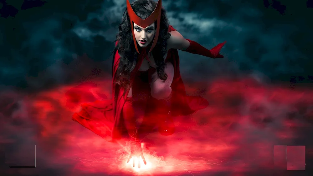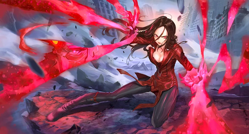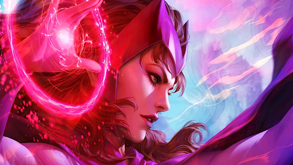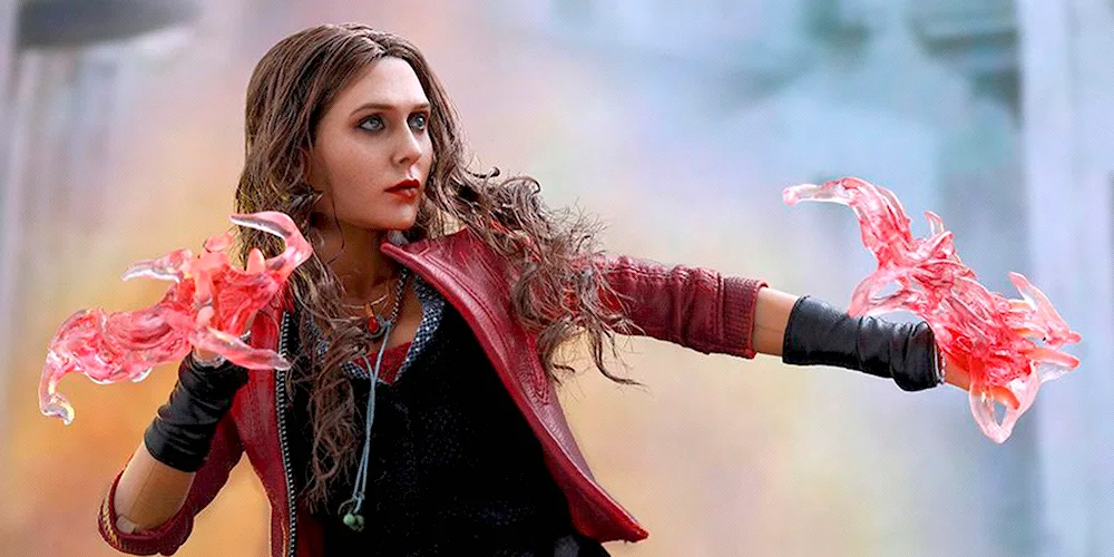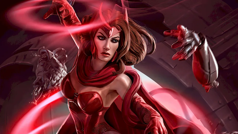 Photos of Scarlet Witch show her powerful abilities in action, manipulating reality with her red energy. Images showcase her iconic red costume and intense facial expressions as she battles against enemies.