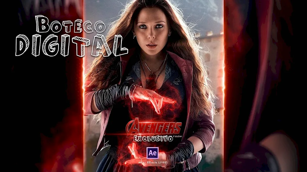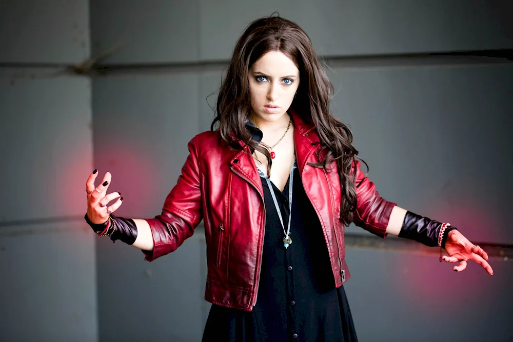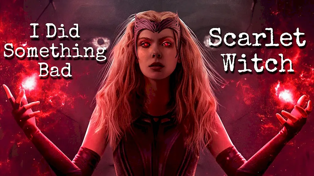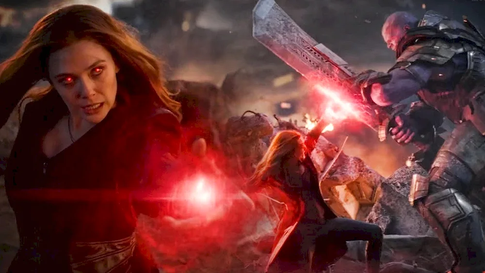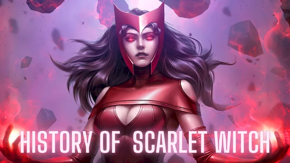 Photos of Scarlet Witch show her powerful abilities in action, manipulating reality with her red energy. Images showcase her iconic red costume and intense facial expressions as she battles against enemies.