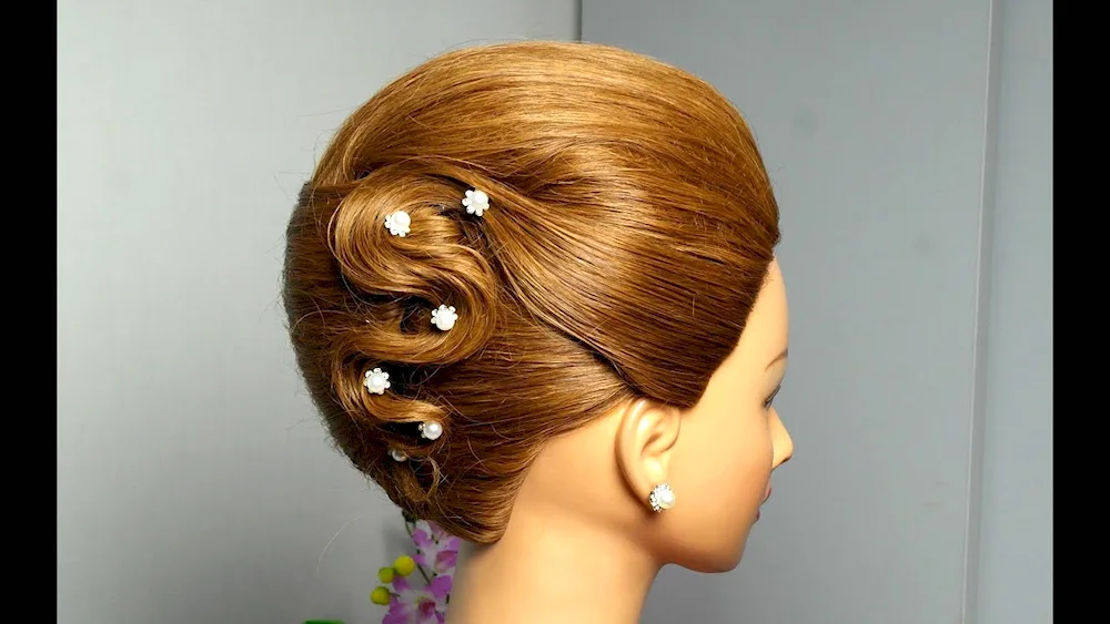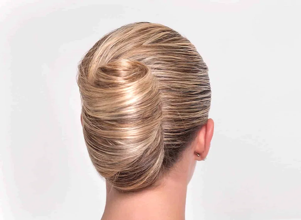 Medium length hair styled in a chic shell hairstyle, perfect for a special occasion or a night out. The elegant updo features twisted sections of hair forming a beautiful and intricate design.