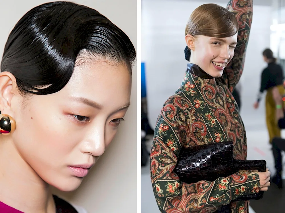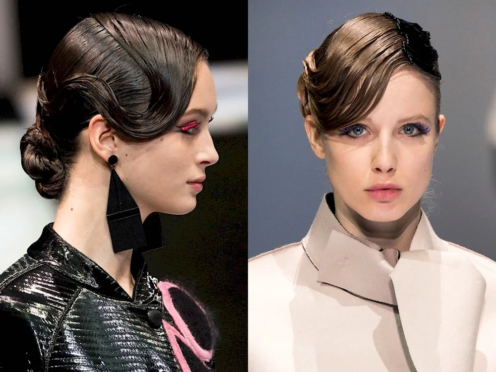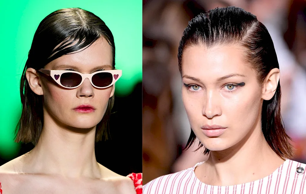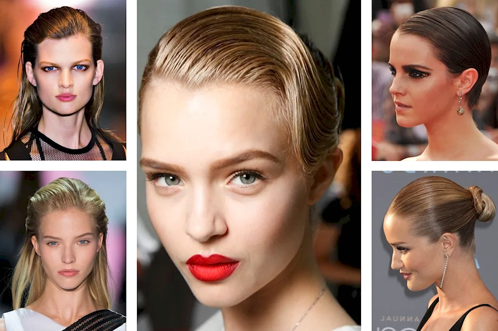 Photos of women sporting sleek and elegant hairstyles with their hair slicked back, showcasing a chic and polished look perfect for any occasion. The images capture the timeless and versatile appeal of this hairstyle, whether styled with a deep side part or worn in a ponytail.