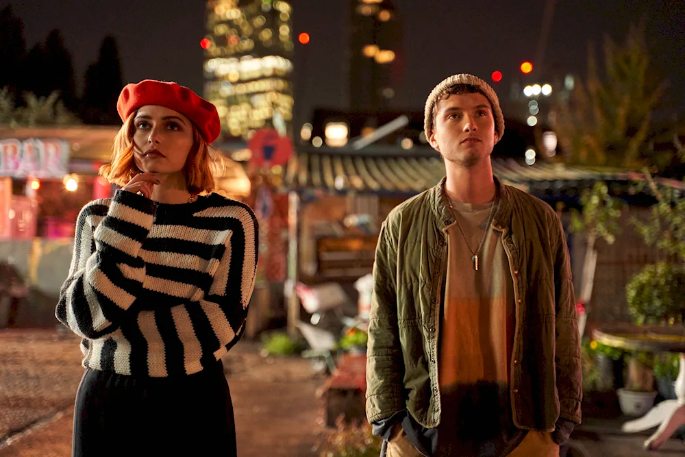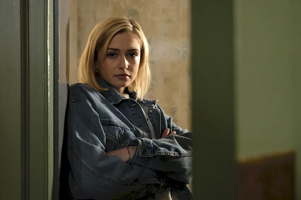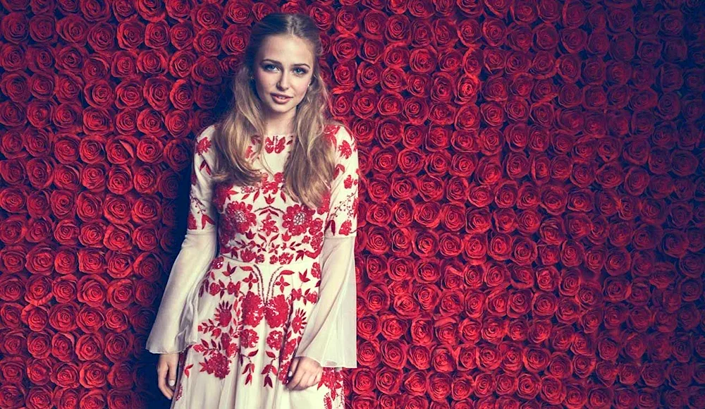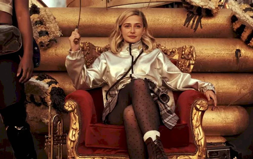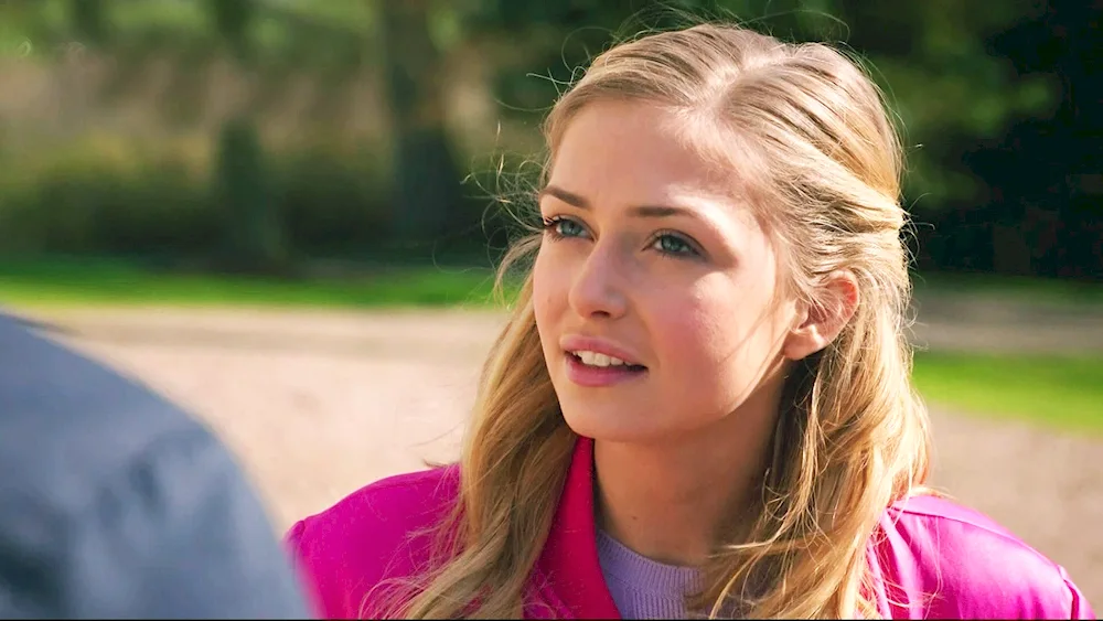Sophie Simnett Sophie Simnett is seen posing on the red carpet in a stunning black gown, smiling at the camera. Another photo shows Sophie in a behind-the-scenes shot from her latest film, looking focused and determined on set.