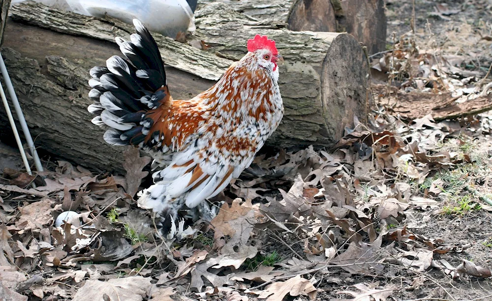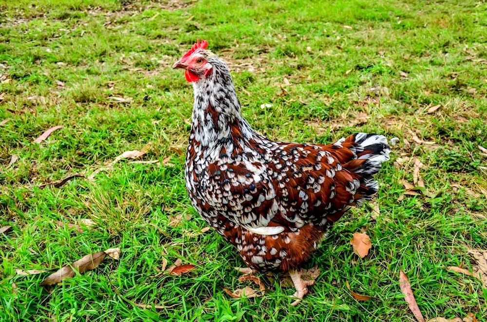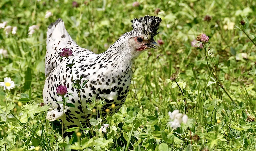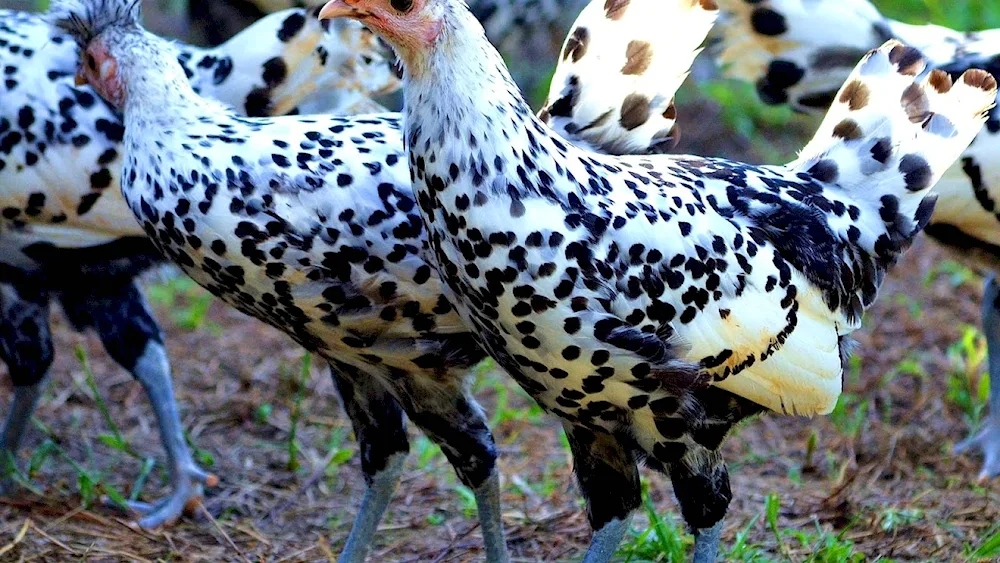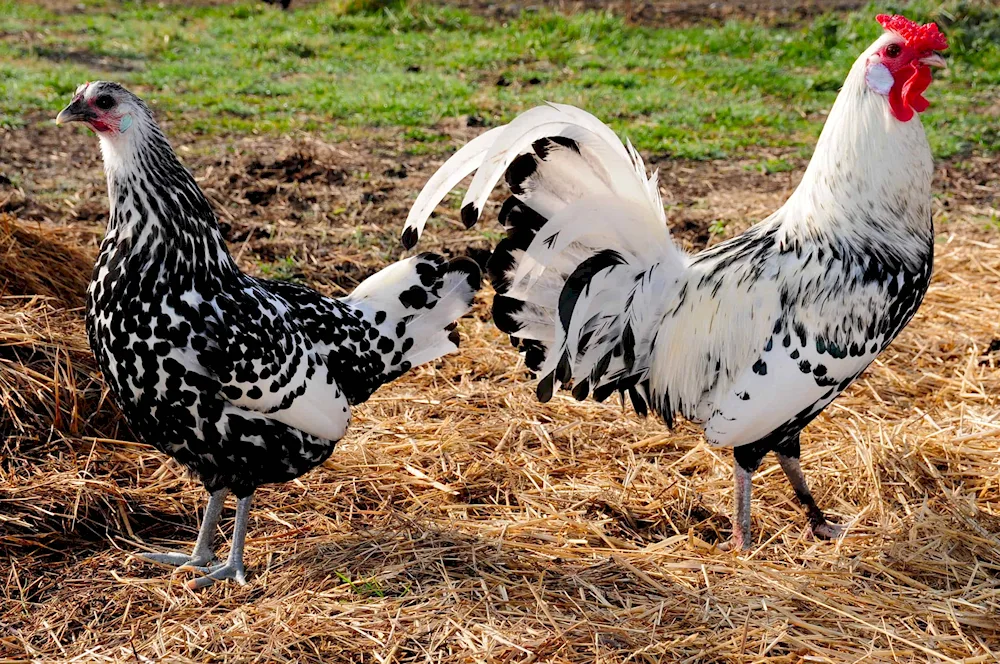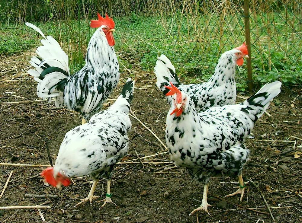 Speckled hens Speckled hens: A close-up shot of a beautiful speckled hen perched on a wooden fence, with vibrant feathers and a curious expression. Another image shows a flock of speckled hens roaming freely in a lush green field, pecking at the ground.