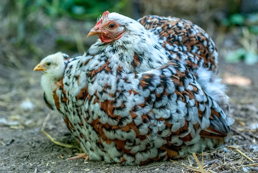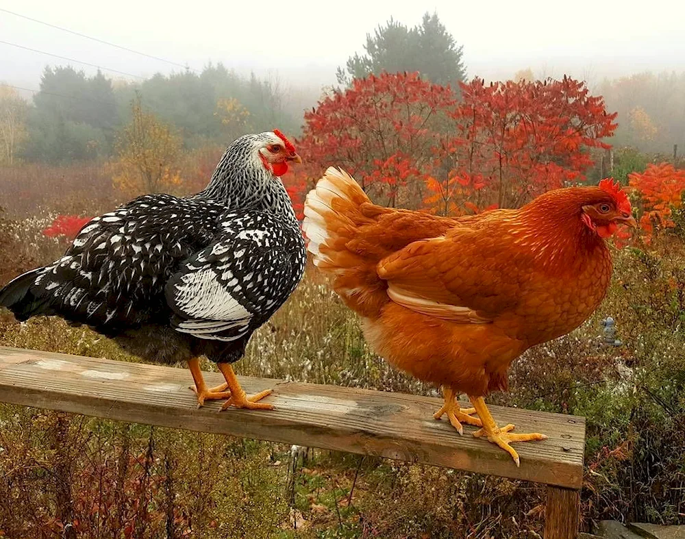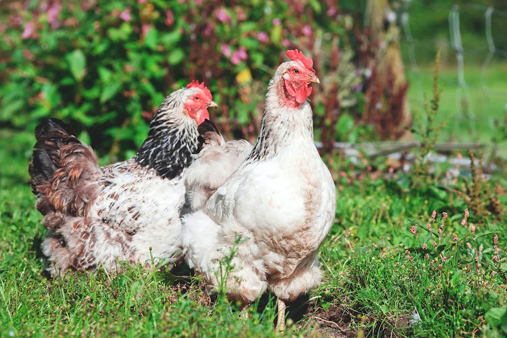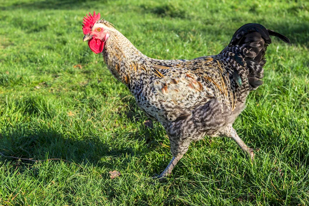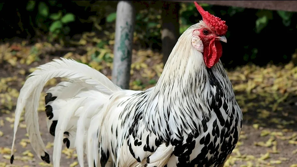 Speckled hens Speckled hens: A close-up shot of a beautiful speckled hen perched on a wooden fence, with vibrant feathers and a curious expression. Another image shows a flock of speckled hens roaming freely in a lush green field, pecking at the ground.