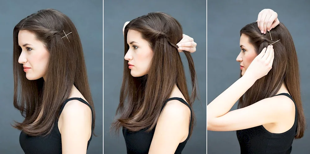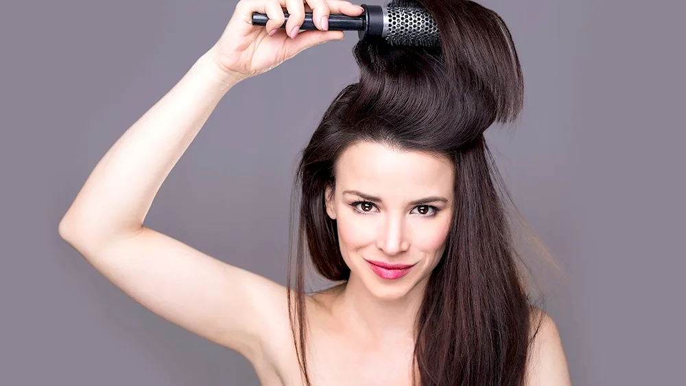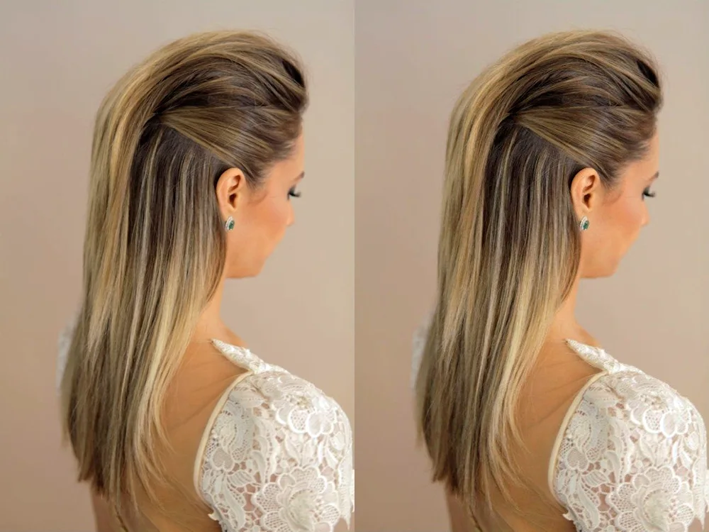 Examples of images showing straight hair styled with backcombing include one picture of a woman with long backcombed hair with voluminous roots, another image of a sleek ponytail with subtle backcombing for added lift, and a third photo of a half-up half-down hairstyle with teased sections for extra texture.