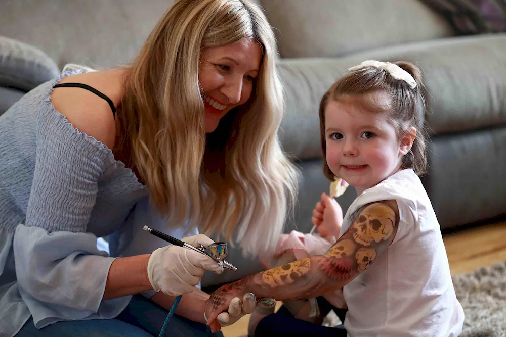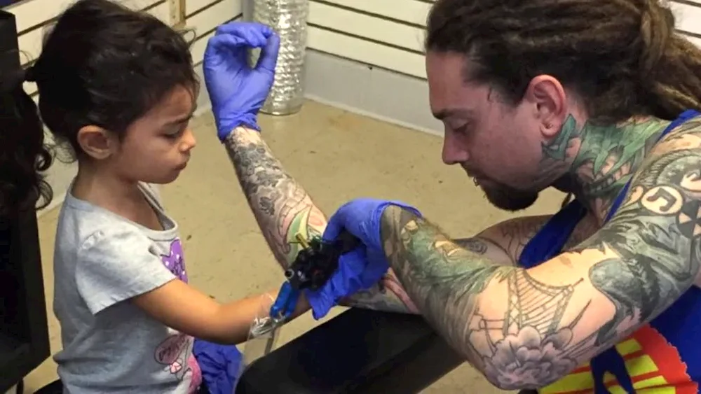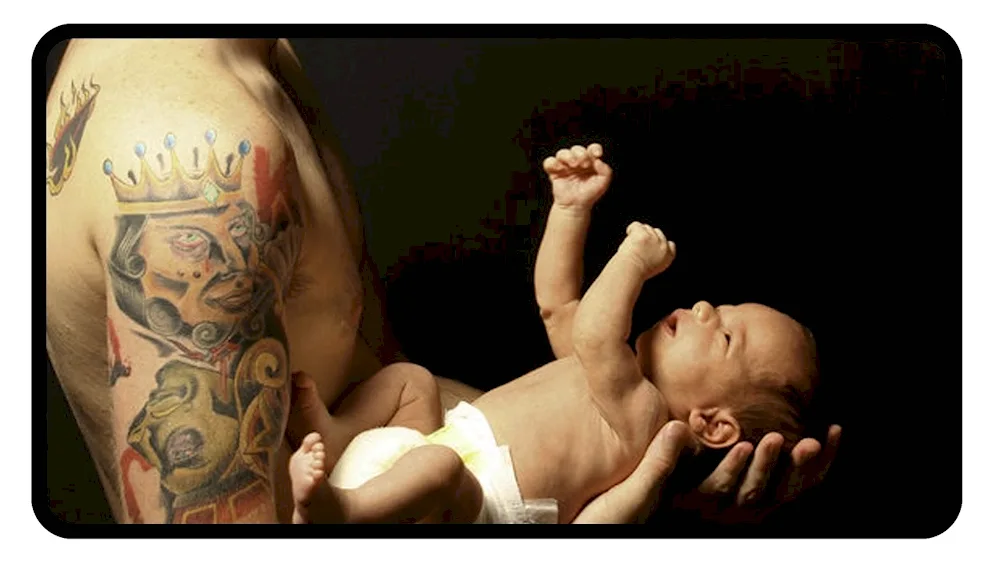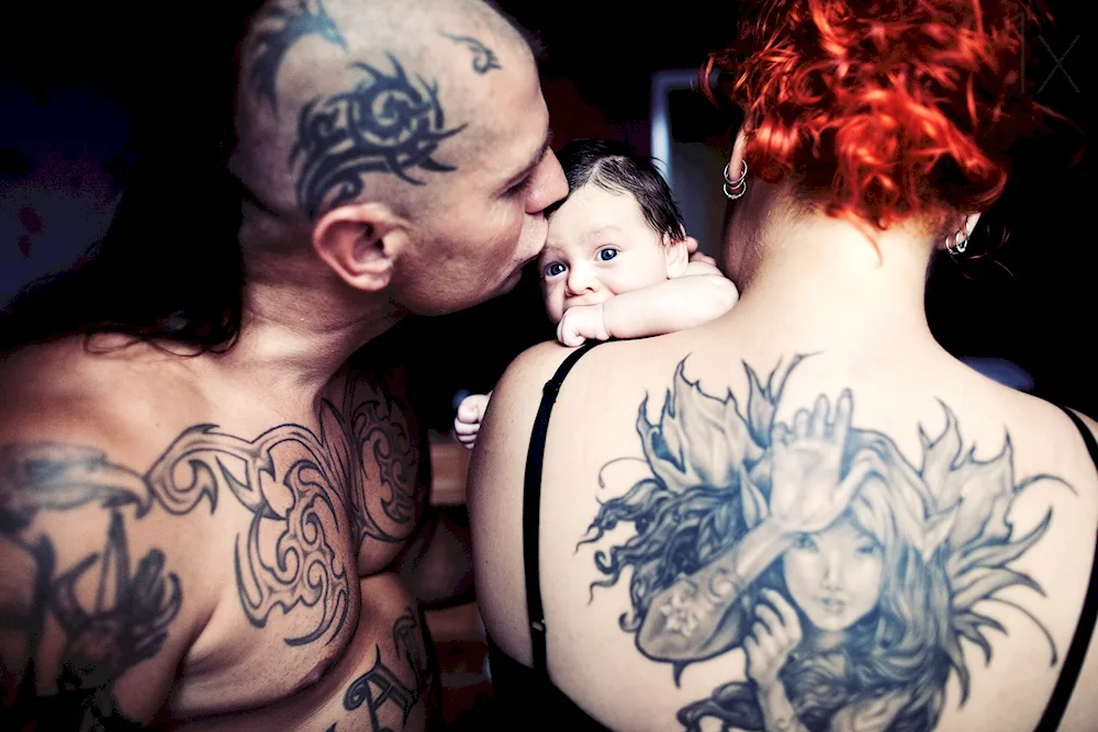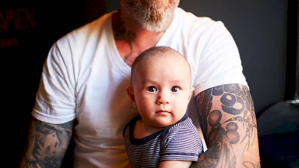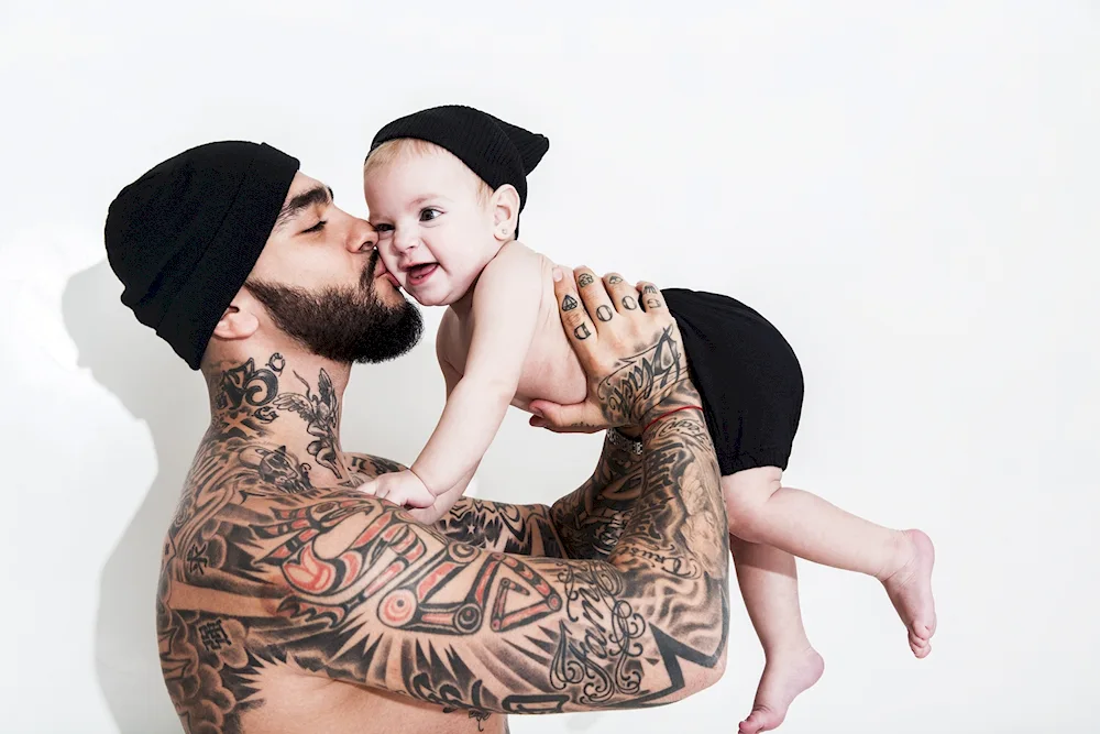 Tattoo dad with daughter Photos of a father with tattoos spending quality time with his young daughter, showcasing a beautiful bond between them. The images capture a mix of toughness and tenderness in their relationship, making for heartwarming moments to cherish.