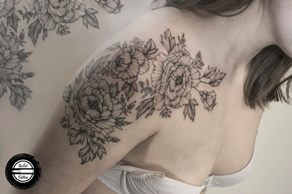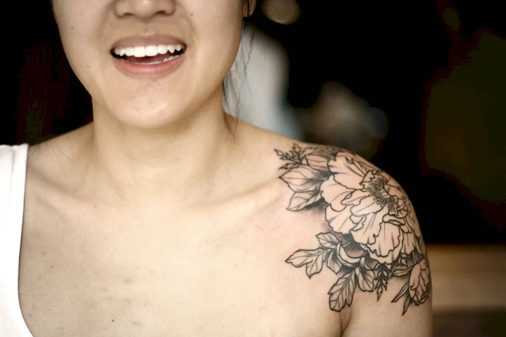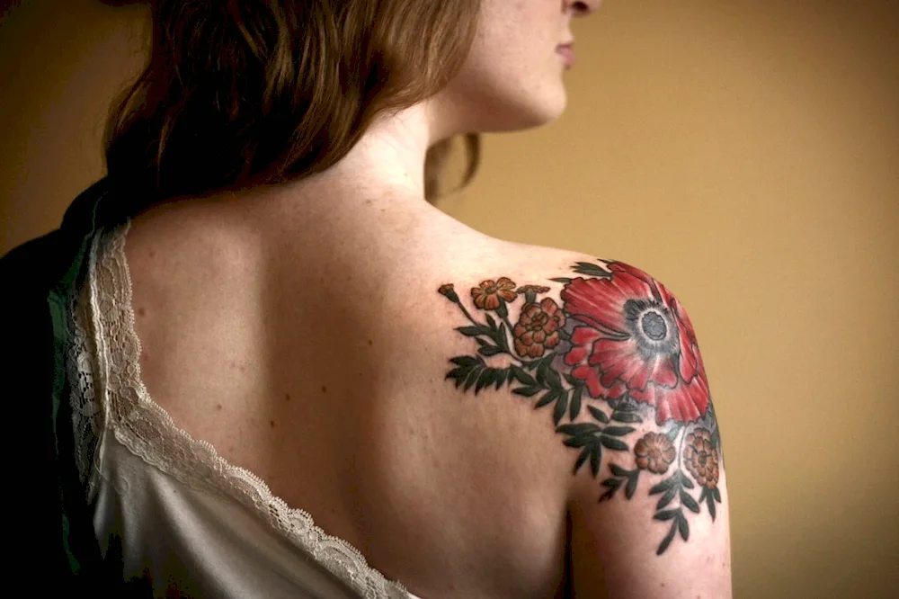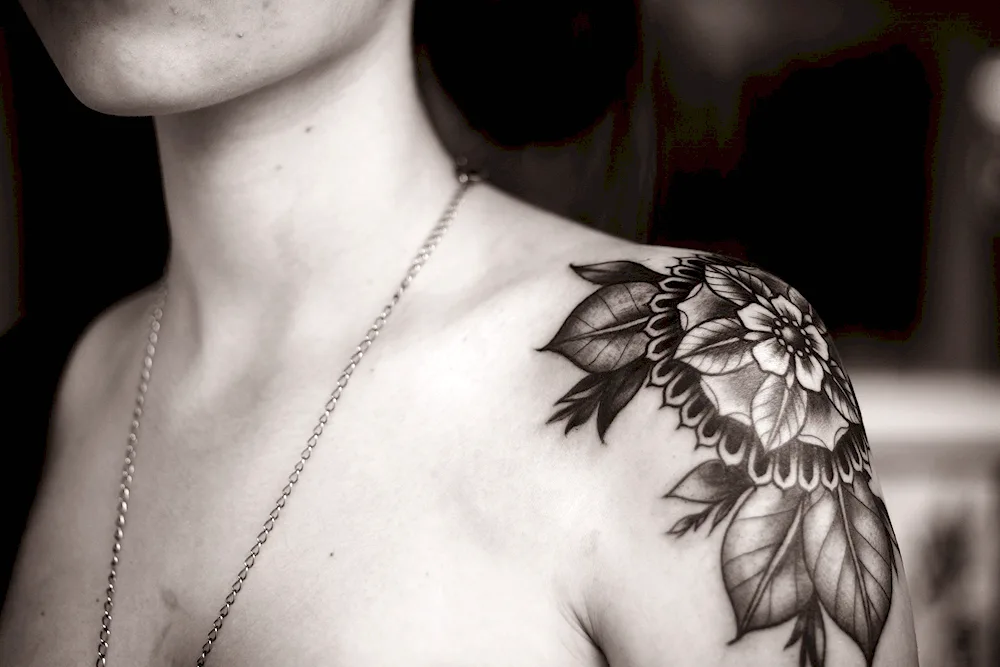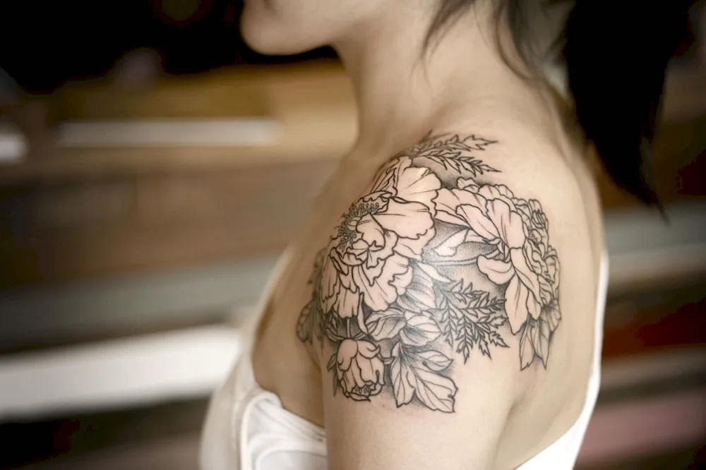 Check out these stunning shoulder tattoos of women I found online - one is a beautiful portrait, another features intricate floral designs, and the last one has a bold and colorful peacock. Each tattoo is unique and truly showcases the artistry and creativity of the tattoo artist. Enjoy!