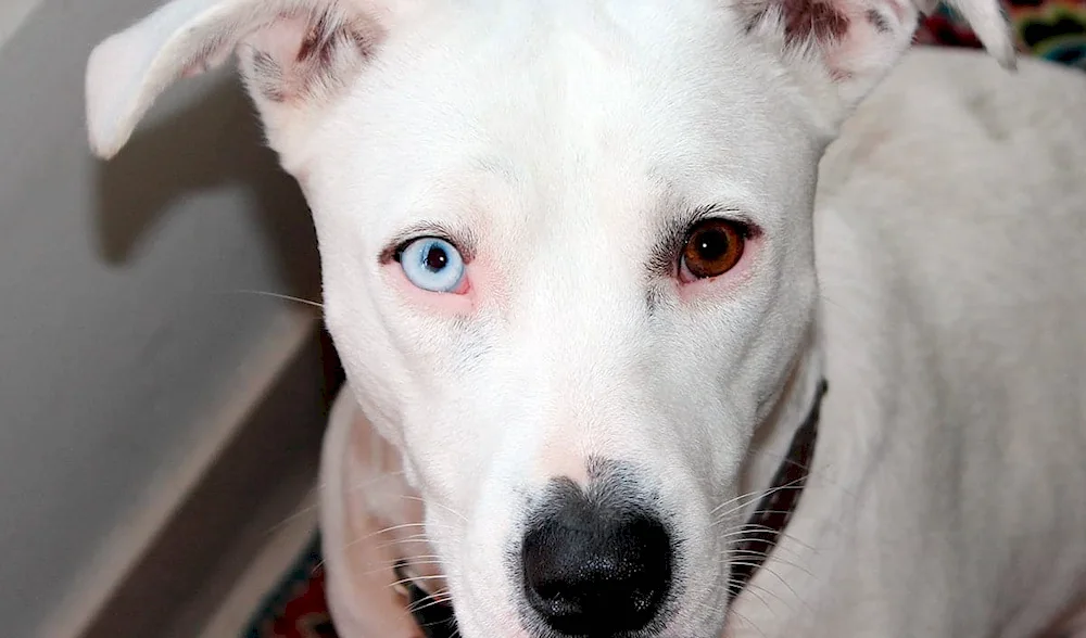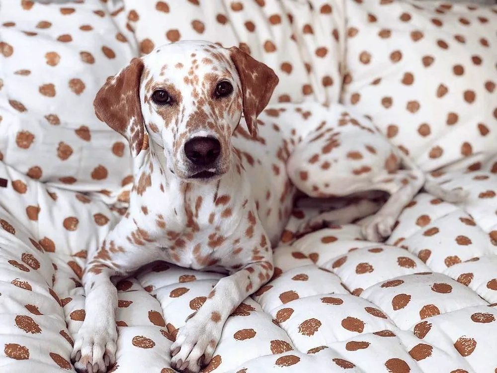 The dog is white with brown spots