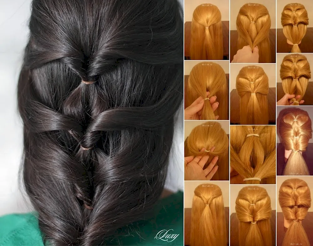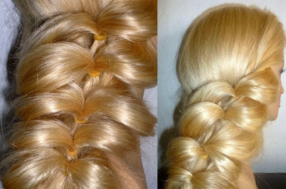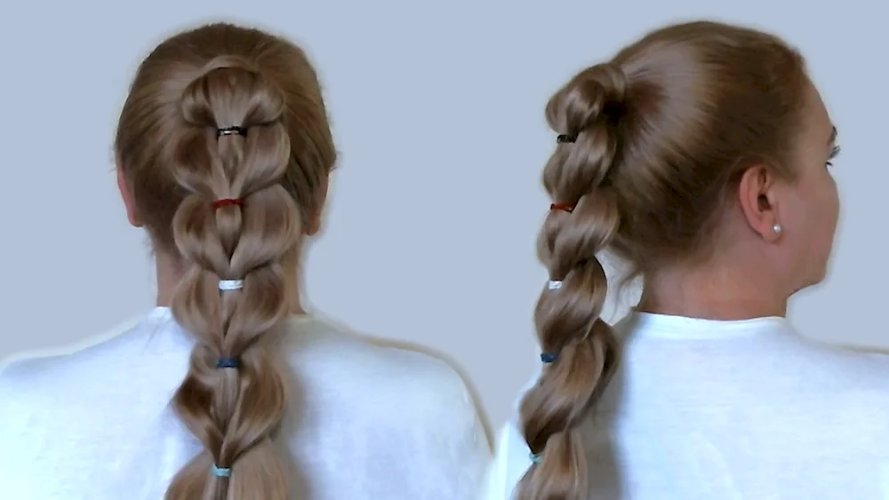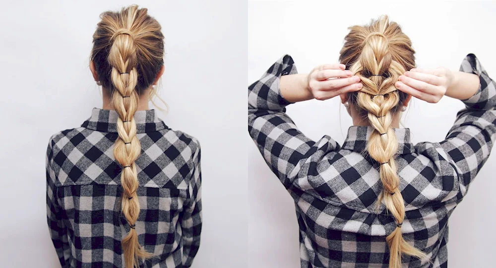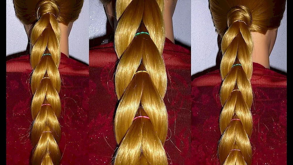 Instructions on creating a big braid hairstyle using elastic bands are shown step by step in the images - perfect for anyone looking to achieve a stylish and voluminous look. The photos detail each stage of the process, making it easy to follow along and recreate the hairstyle at home.