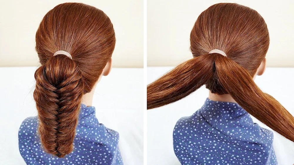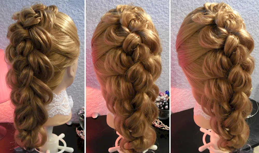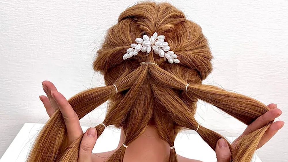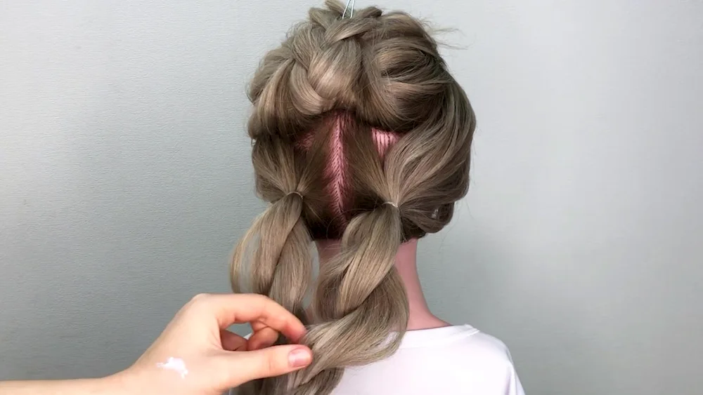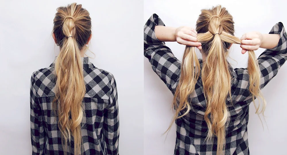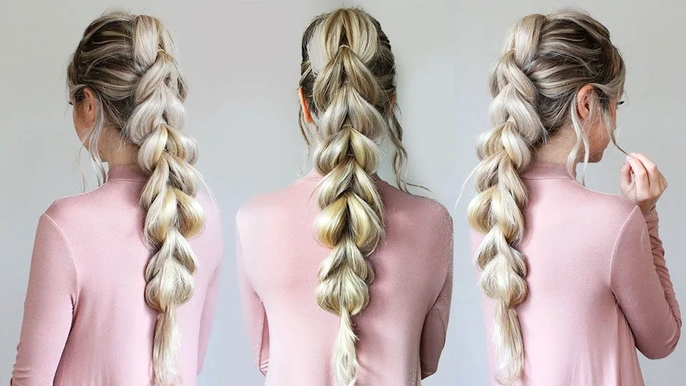 Instructions on creating a big braid hairstyle using elastic bands are shown step by step in the images - perfect for anyone looking to achieve a stylish and voluminous look. The photos detail each stage of the process, making it easy to follow along and recreate the hairstyle at home.