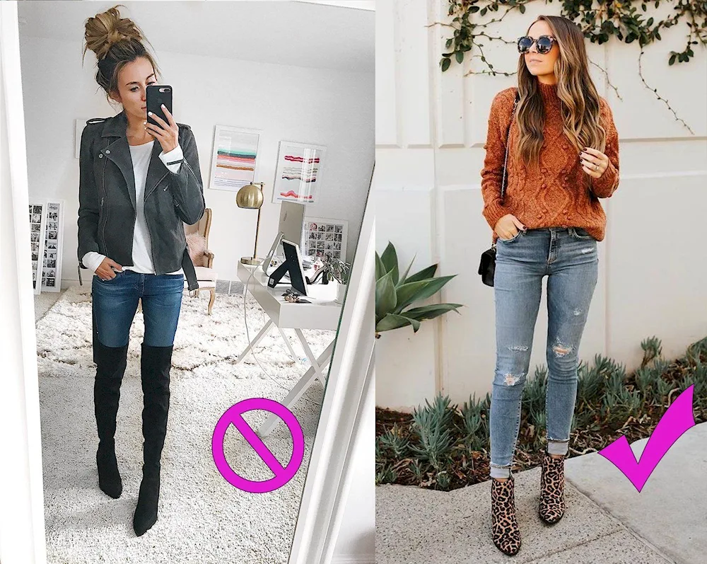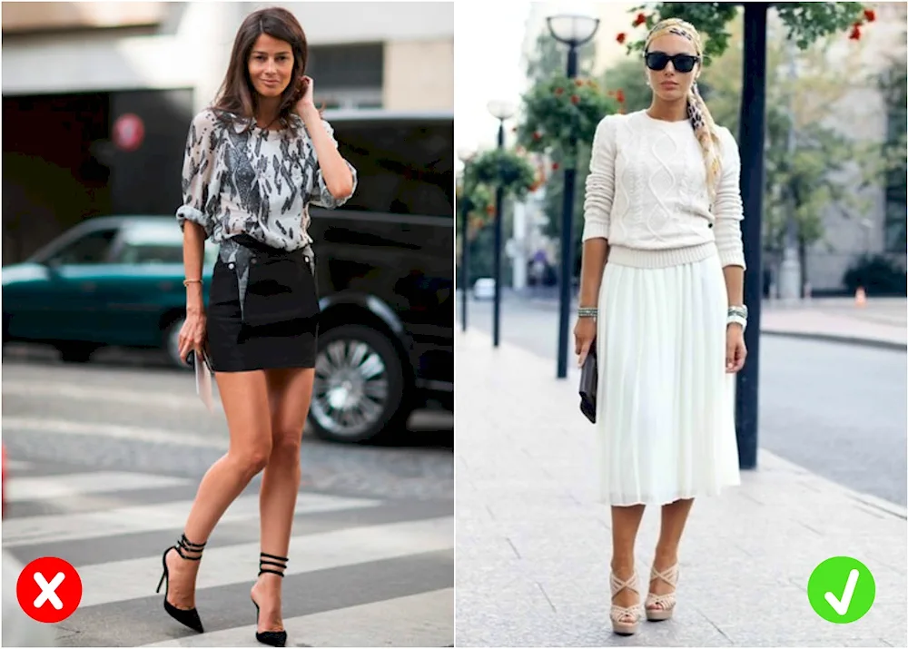 Outfit ideas for slim legs: a high-waisted skirt with fitted crop top, skinny jeans paired with oversized sweater, and a mini dress with knee-high boots to create the illusion of volume. Don't shy away from bold prints, textures, and accessories to add visual interest to your slender legs.