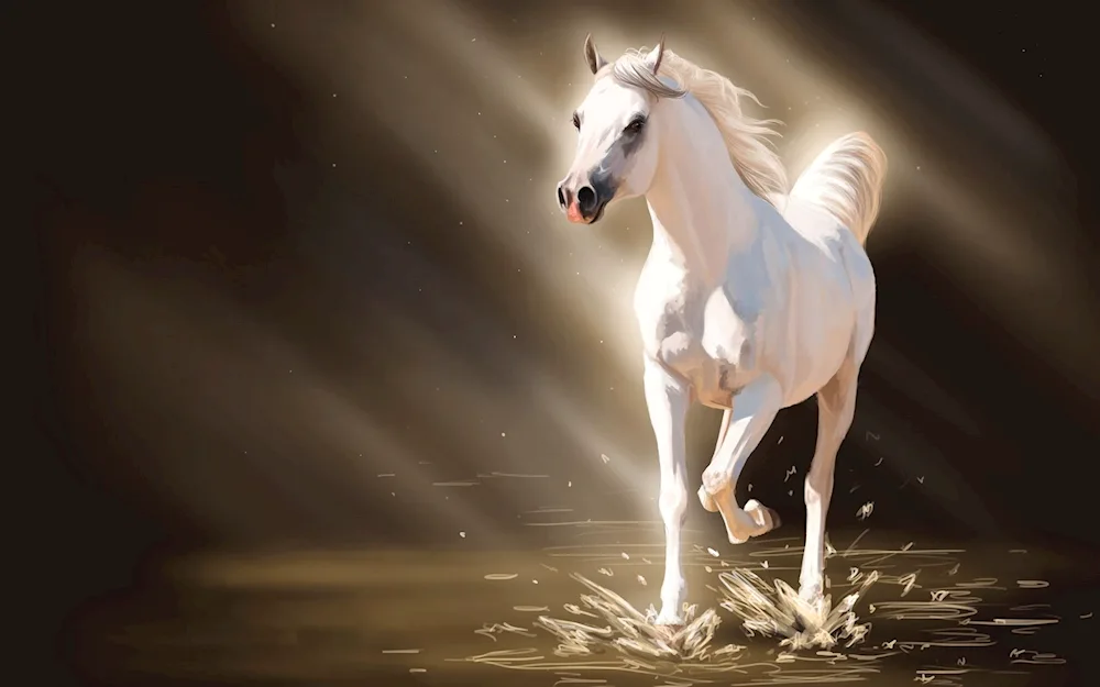 White Horse Photos of a majestic white stallion galloping freely in a green meadow, mane flowing in the wind. Images of a white horse peacefully grazing in a field under the golden sunset, creating a serene and magical atmosphere.