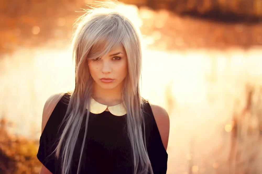 Photos showing strands of white hair framing the face and styled with bangs, giving a youthful and trendy look. The images capture different hair lengths and styles, providing inspiration for those looking to incorporate white strands into their hairstyle.